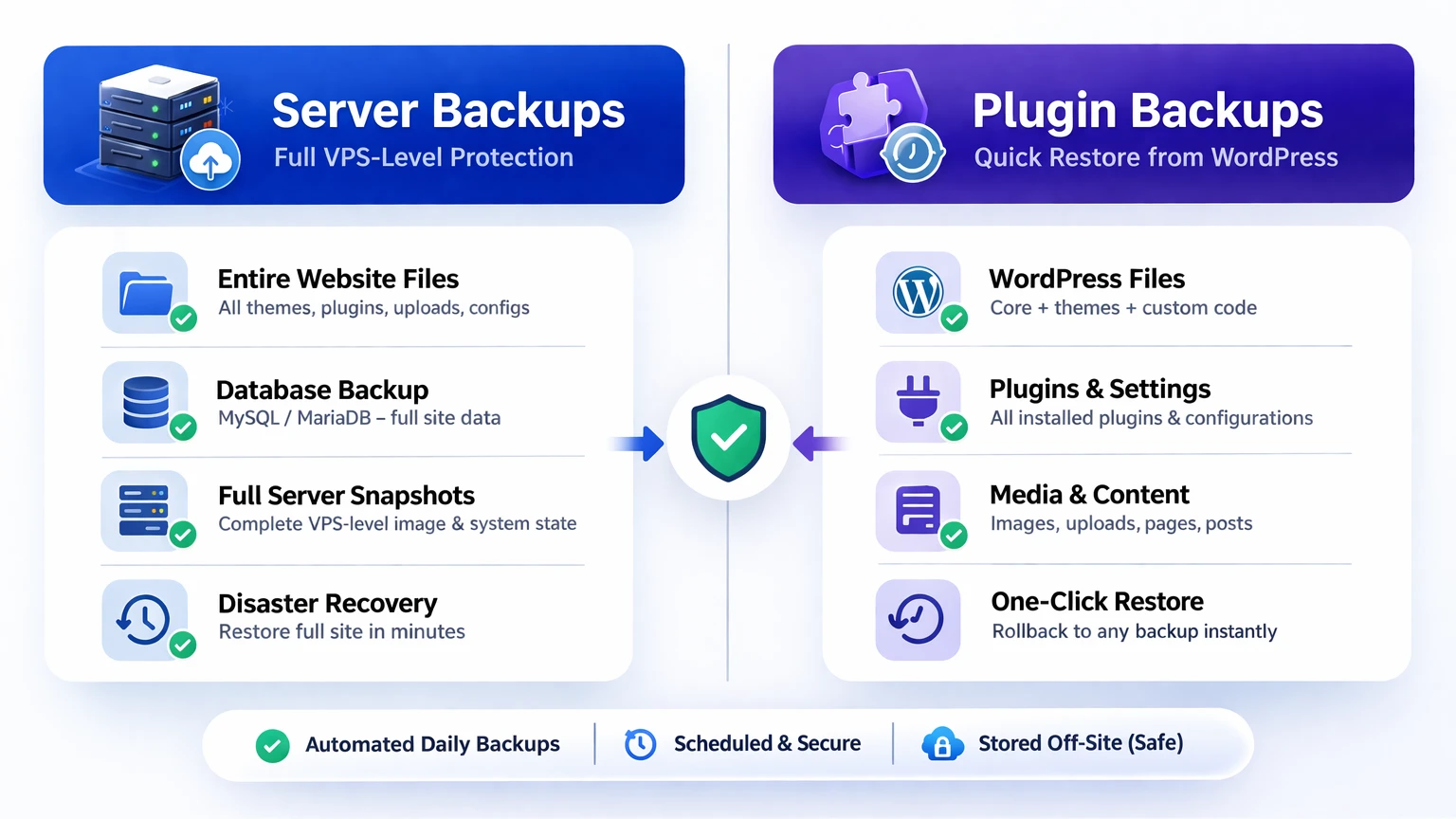 Backups are your safety net. If an update breaks your site, a plugin conflicts, or something is deleted by accident, backups let us roll your site back to a clean restore point.