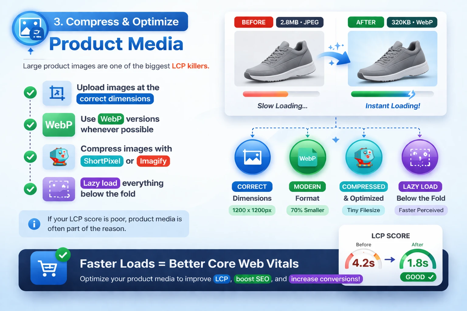 If your LCP score is poor, product media is often part of the reason. This ties directly into improving Core Web Vitals for eCommerce sites.